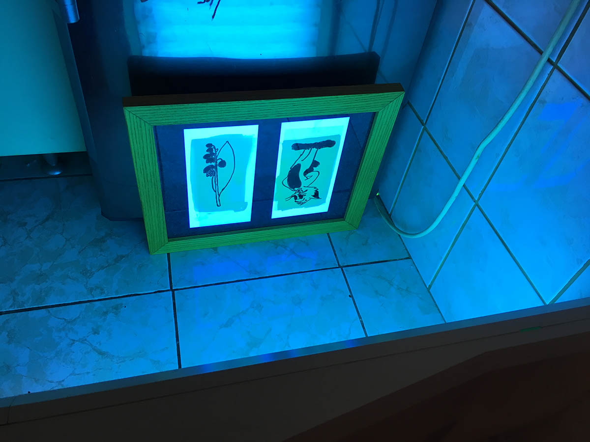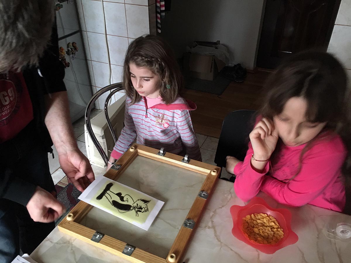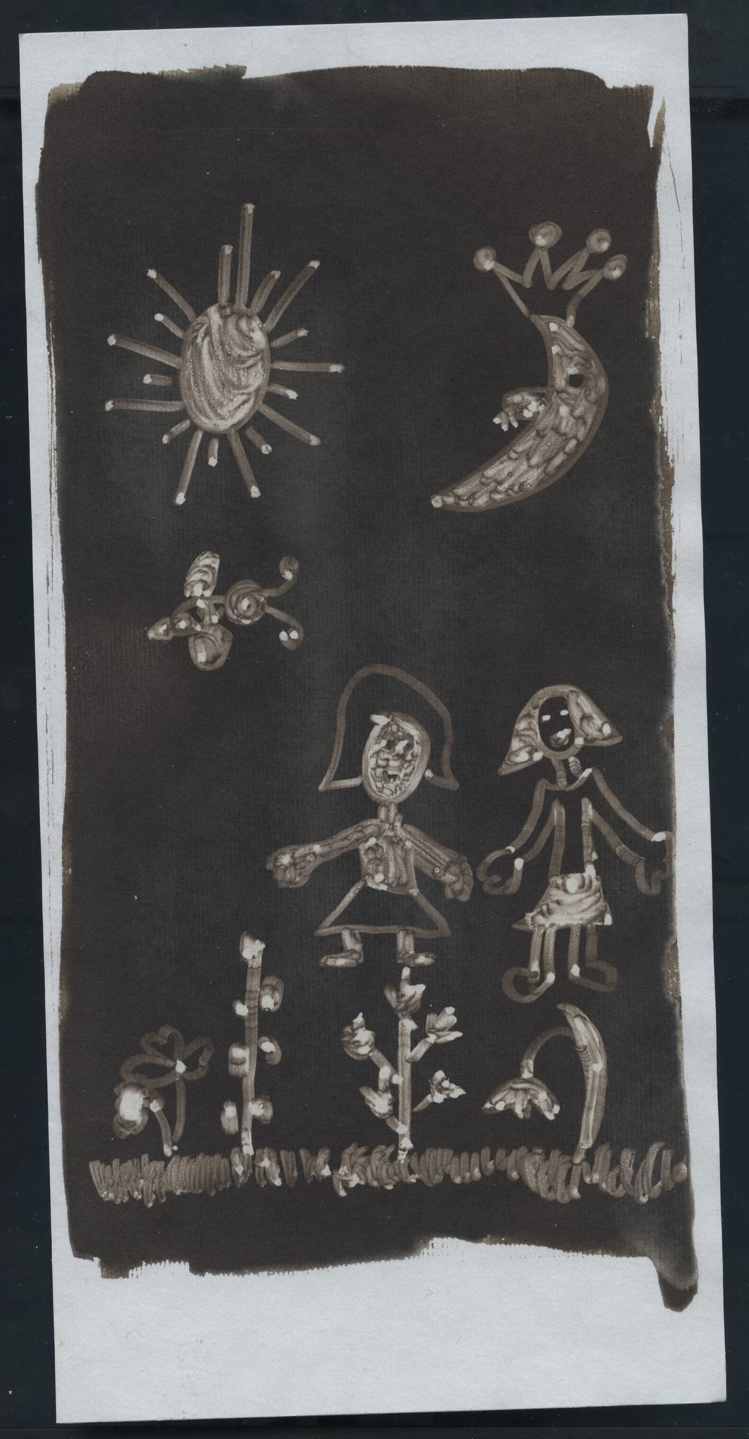 Mai intai au desenat cu markere permanente pe folie, prima oara dupa un contur iar apoi ce au vrut ele. A urmat apoi intinderea solutiei argentice pe hartie si uscarea ei (rapida, cu feonul :D). Au pus apoi in presa si au expus cu ajutorul unui aparat de bronzat :). Magia a continuat in baie, unde pozele au fost spalate, apoi tonate si in cele din urma fixate. Ce sa mai, o joaca de copil!