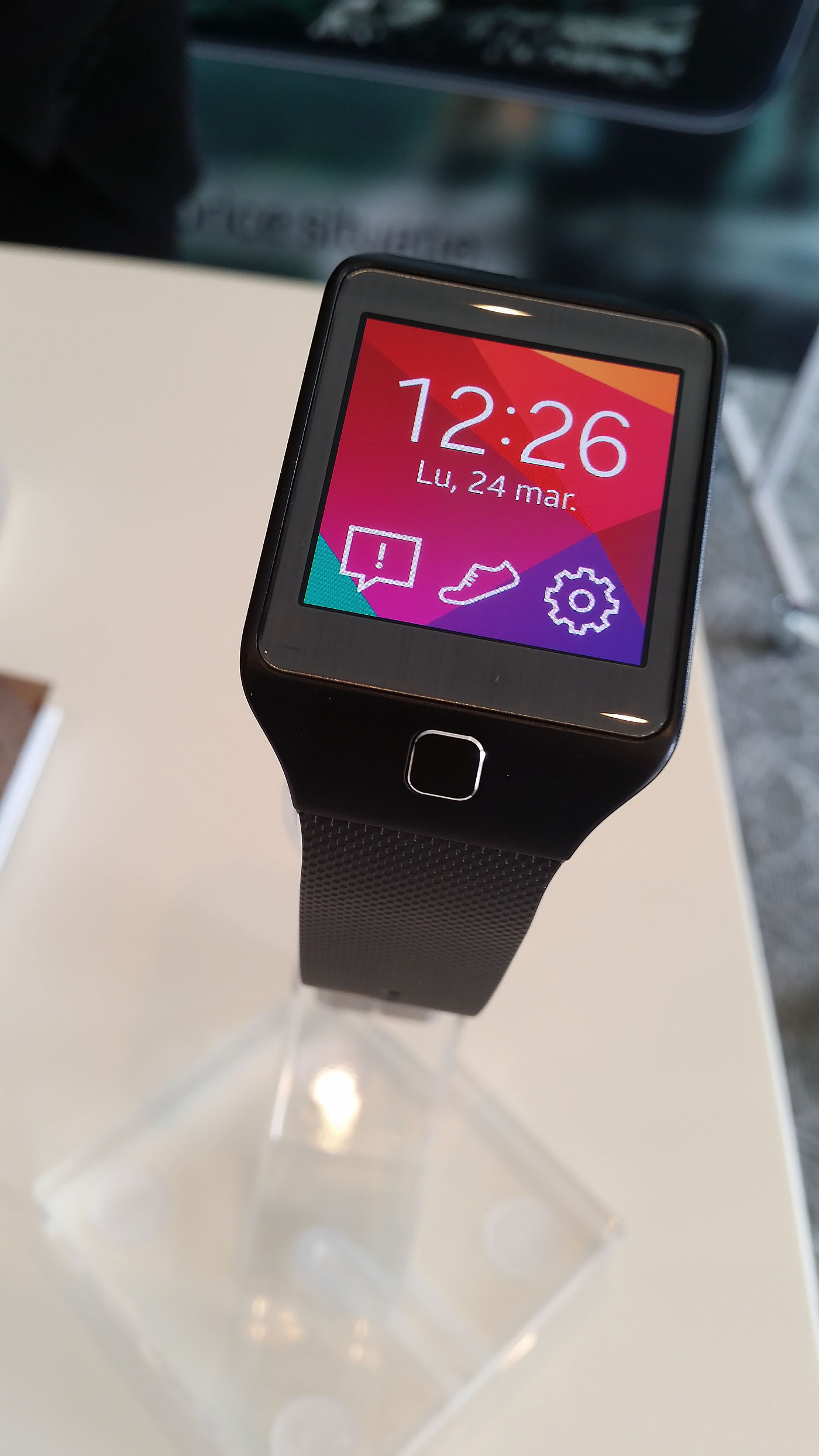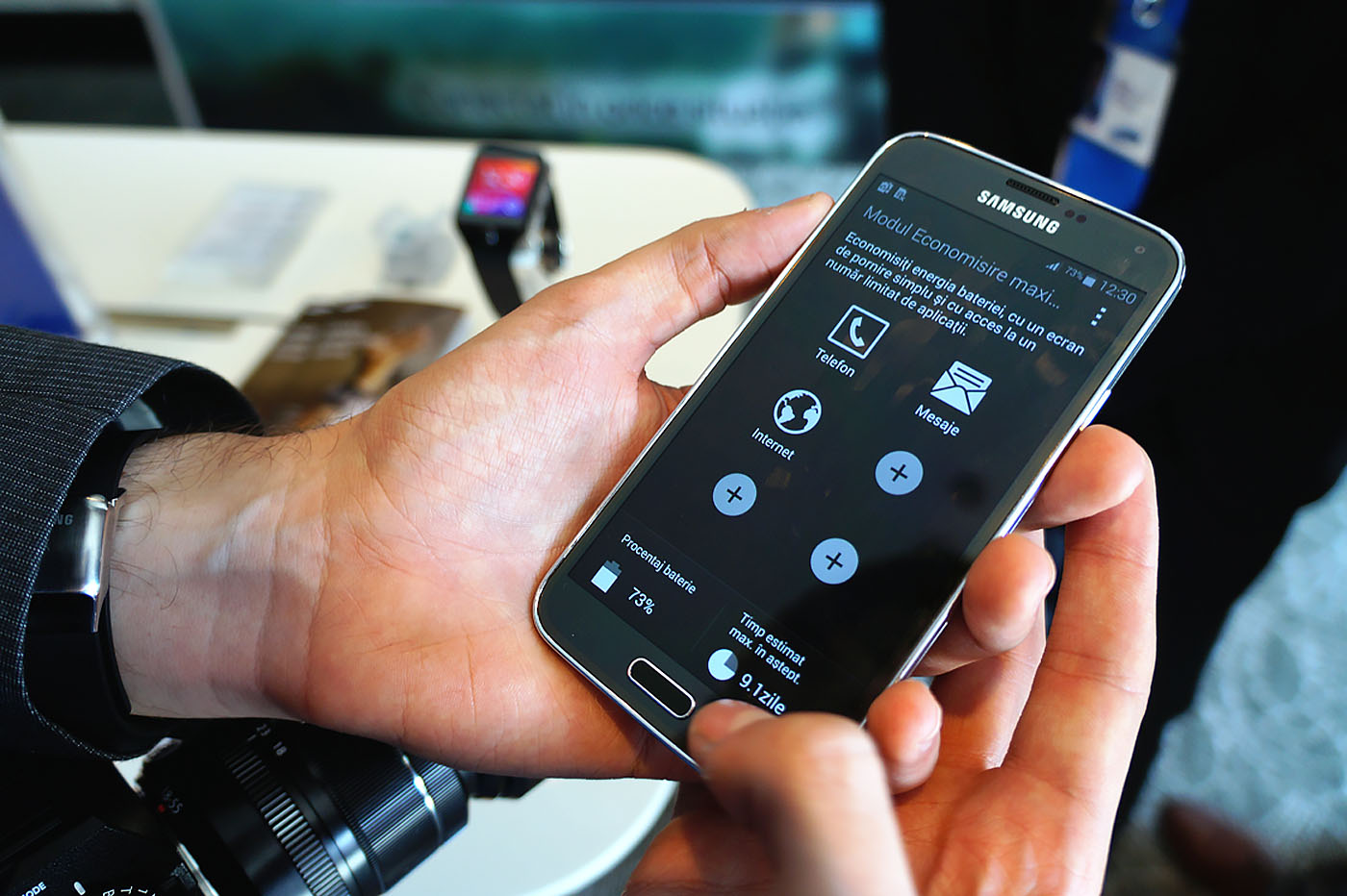 In primul rand ecranul este fantastic de bun, avand culori si contraste extraordinare. In al doilea rand, camera s-a descurcat excelent, focalizand rapid pentru un smartphone. Iata o imagine facuta cu noul Galaxy S5 pe care mi-am trimis-o pe mail imediat dupa ce am realizat-o. In cadru, noul smart-ceas Gear 2, lansat tot astazi