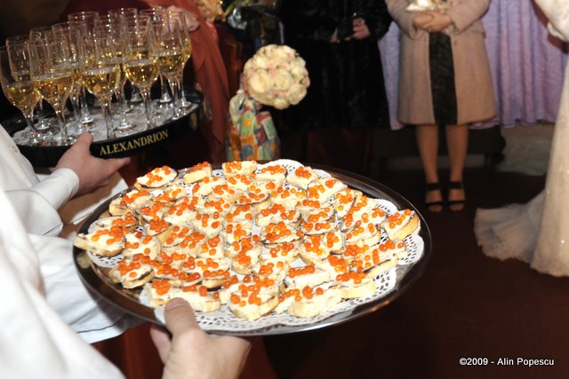 • 80-150 euro pentru un meniu – si mancarea e importanta ca nunta sa iasa bine. Sarmalele sunt demodate, acum sunt bune doar icrele de manciuria (pe care saraca bunica de la tara nici nu stie cum sa le manance si le lasa deoparte ca nu-i plac “margelele alea portocaliile”), somonul fumee (cu accent pe penultimul e), si cine stie ce alte minunatii nelipsite de la o nunta pe cinste. Pe gura intra, pe unde stim cu totii iese …